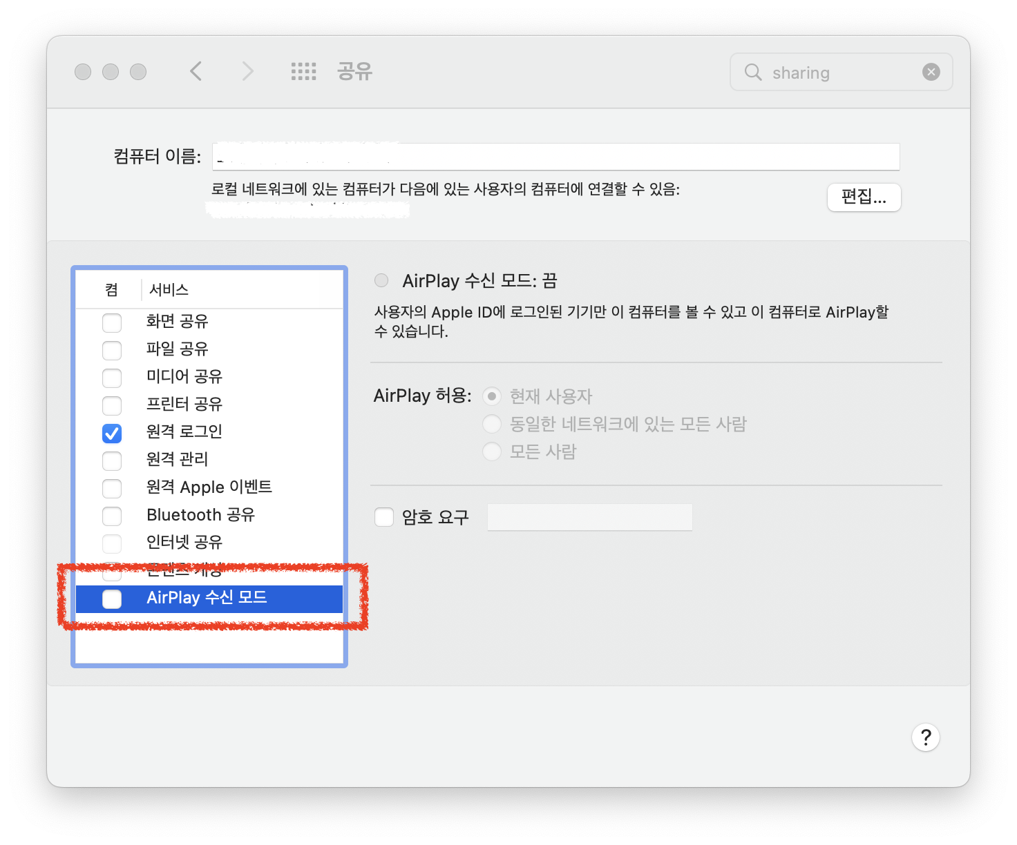 3️⃣ 세 번째, 맥북 사용자라면 위 오류코드에도 나와있는 방법대로 Mac에서 Apple 메뉴 > 시스템 설정(System Preferences) > 공유(Sharing)로 이동해 AirPlay 수신모드(AirPlay Receiver)를 사용 안함으로 설정하면 된다.